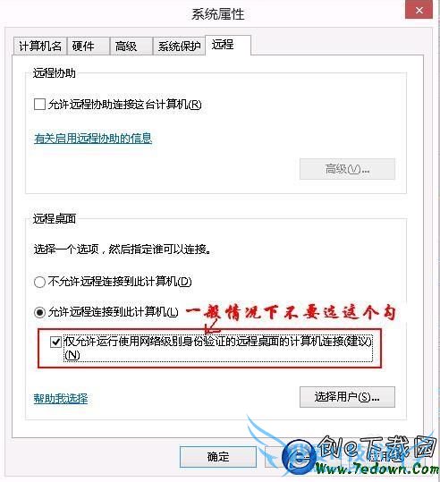3、如果你在win8中设置了远程连接需要网络级别身份验证,由于xp默认没有开启,所以当xp连接win8远程桌面时,就会出现“客户端无法建立跟远程计算机的连接”错误提示。所以如果没有特殊要求,应该在win8中把“仅允许运行使用网络级别身份验证的远程桌面的计算机连接”的选取勾去掉。