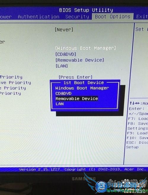 3、移动光标到“First Boot Device”选项,然后按"Enter"键。出现对话框后,将光标移动到“Removable Device”,然后按“Enter”.