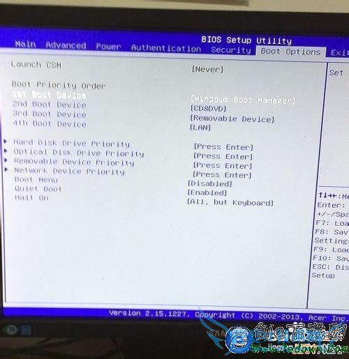 2、按键盘区的箭头方向键,移动选择项至“Boot Options”(启动选项。)