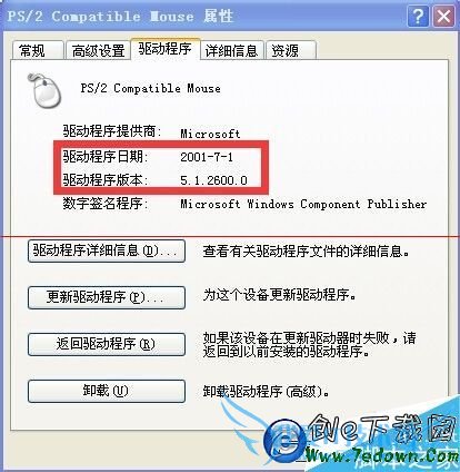 3、点击“返回驱动程序”如上图,之后驱动版本回滚到:5.1.2600.0版本,如下图.