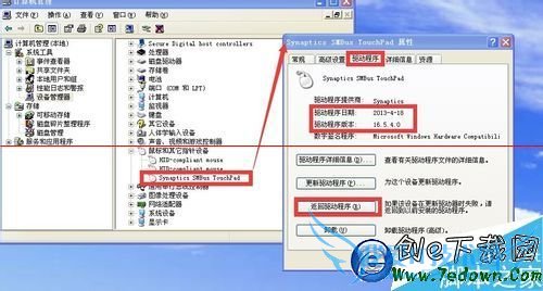 2、桌面“我的电脑”右键,打开系统属性,点击“设备管理器”,打开设备管理器窗口,找到“鼠标和其他指针设备”双击点开,找到“synaptics SMBus touchpad(不同机型名称有差别)”。双击打开synaptics SMBus touchpad属性窗口,确认驱动版本为16.5.4.0,更新时间为2013-4-18.