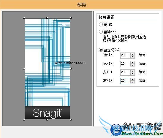 我们可通过截图软件设定自动切边处理。如Snagit软件中就有“效果→裁剪”设定,可选择自动检测并裁剪图像周边的纯色区域,也可以自定义要剪掉的四周尺寸(图6)。设定之后截取图片,抓取结果将是截掉边缘的图片。