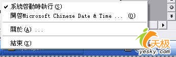 另外,该软件还为您显示四个不同时区的时间和日期以及白天或夜晚等相关信息。您可以自己选定所需要的时区,键入相应的城市名,或将四个时区中的某一个时区设置为系统时区。白天为6:00到18:00,用“太阳”图形表示;夜晚为18:00到6:00,用“月亮”图形表示。通过点击“飞机”按钮,您可以选择不同的时区(如图4)。点击非灰色(绿色)“铃铛”按钮,可以将此铃铛所在时区设置为系统时区,这时会出现一个警告窗口,问“系统时区将被设置为:[XXXXX标准时间]。您想继续吗?”的提示(如图5)。Microsoft Chinese Date & Time被安装后,一个象翻开的台历的图标就会出现在任务栏系统通知区,表示Microsoft Chinese Date & Time正在运行。用鼠标右键点击此图标,您将看到如下菜单(如图6)。如果您不希望Microsoft Chinese Date & Time在系统下次启动时自动运行,可将 “系统激活时执行” 的选择去掉;选择 “打开Microsoft Chinese Date & Time ...” ,可以打开Microsoft Chinese Date & Time主窗口;“关于…”菜单是显示版本及版权信息;而如果选择 “结束” ,将退出Microsoft Chinese Date & Time。