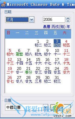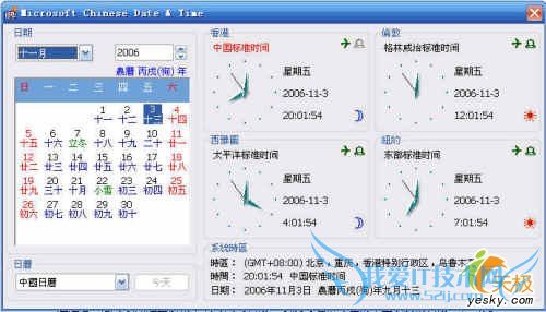 你是否想让你的电脑具有显示农历日期并能轻松查找二十四节气和时区的功能。Microsoft Chinese Date & Time (中国日历与世界时钟)就是微软公司专门为中国Windows XP Home Edition 和Windows XP Professional 用户开发制作的日历程序。下载安装后在任务栏系统托盘处会显示一个象翻开的台历的小图标,把鼠标指针指向它就可以显示出当前时间、日期以及对应的农历日期和时区信息(如图1)。如果双击它就可以具体地察看日历了(如图2),在左下角的“日历”中选择“中国日历”就可显示农历,农历年的名称也被显示在日历上方。而且还可选择四个时区来同时显示。通过它您可知道 “今天” 的公历与农历日期。在日历中星期六、星期日用红色表示;24节气用绿色表示;春节,元宵节、中秋节、端午节用红色表示。在公元1960年1月1日至公元2099年12月31 日范围之内,您可以通过选择不同的 “年” “月” “日” 来查询相应的日期。当您 “流览” 到其它日期后,还可以通过点击 “今天” 按钮(如图3),方便地回到今天的日期。深蓝色的方框表示您选择的日期,灰色的方框表示 “今天”。通过 “日历” 下拉列表,您也可以选择显示公历。您可以查询与公历的某一日相对应的农历的日期。