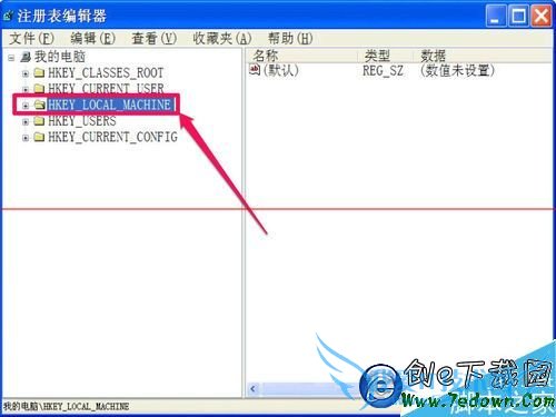 3、进入注册表后,首先选择“HKEY_LOCAL_MACHINE”这一根键,然后点前面的“+”符号,打开它的子项。