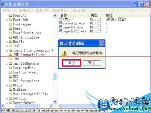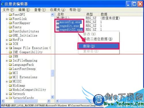 5、在Image File Execution Options的右侧窗口,找到msconfig.exe、regedit.exe、regedit32.exe这三个项,然后右键,全部删掉,确认删除框中按“是”即可,刷新注册表。