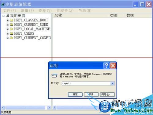 7、然后再回到桌面,在开始菜单中打开“运行”程序,然后再输入regedit命令,这一回,就应该能打开注册表了。