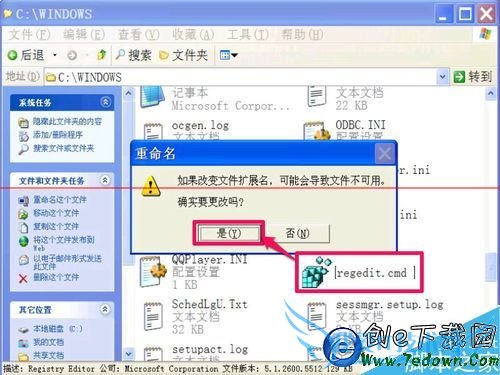 6、最后,返回到到C:\Windows\文件夹下,找到regedit.cmd,将其的扩展名,改回为regedit.exe,弹出确定框,按“是”。
