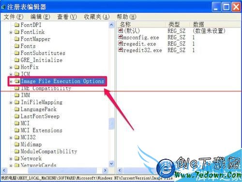 4、在“HKEY_LOCAL_MACHINE”这一根键,依次打开[HKEY_LOCAL_MACHINE\Software\Microsoft\Windows NT\CurrentVersion\Image File Execution Options],最后选定Image File Execution Options这一项。