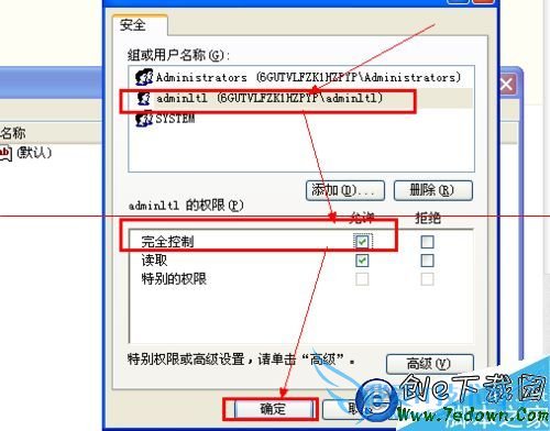 4、点中““组/用户名称”里面的当前的用户名字---->点击“完全控制后面的勾”。再单击“确定”按钮完成权限分配。最后按一下F5键,刷新注册表。