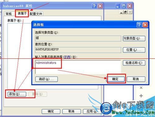 6、把hahaxiao88这个账号纳入管理员组,在属性窗口中,点击“隶属于”选项卡。删除users组,点击“添加”按钮,把Administrators组添加进来。最后点击确定-->应用--->确定。