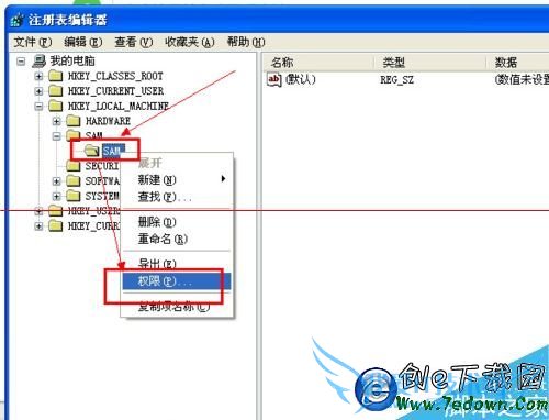 2、在SAM下面的子选项SAM上点击鼠标右键--->权限