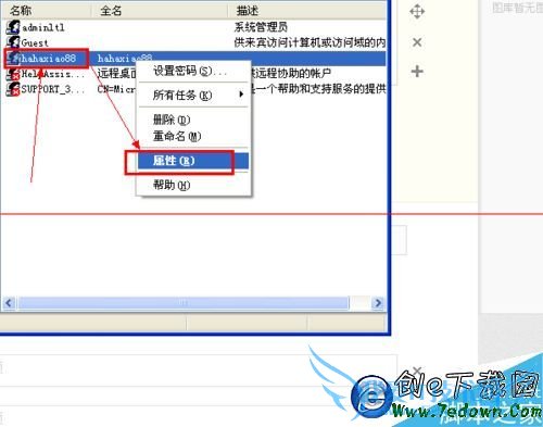 5、进入hahaxiao88用户的属性面板,创建一个用户成功后,我们关闭创建用户的窗口。然后在新创建的那个用户名上点击你的鼠标右键---->属性。
