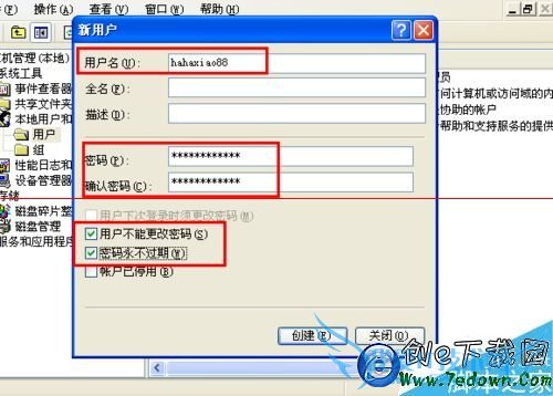 4、增加一个名为“hahaxiao88”的新用户,在“用户名(U)”一行中输入将来隐藏的用户名,在“密码”与“确认密码”中输入你给隐藏用户设置的密码。勾选“用户名不能更改密码”和“密码永不过期”这两个选项。确定以上后,点击“创建”按钮。