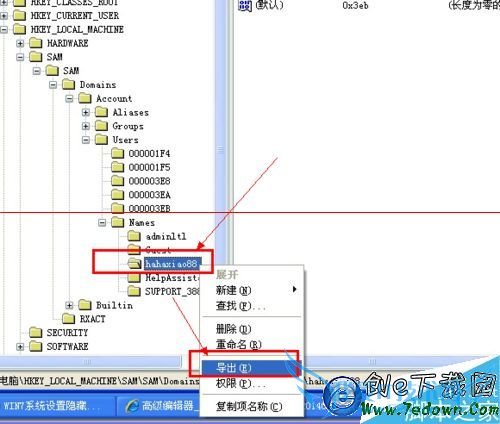 9、分别在含有“3EB”和“hahaxiao88”这两个项上面点击鼠标右键---->导出。我这里导出后生成的文件分别是一个a.reg,和一个b.reg。导出成功后关闭注册表。