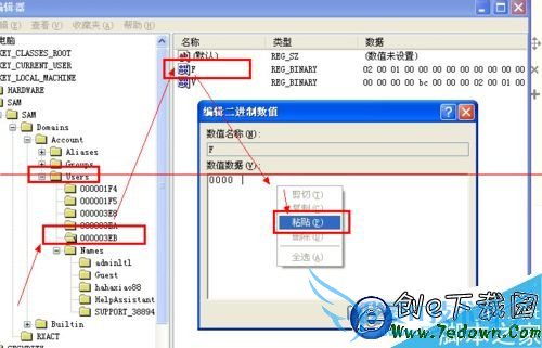 8、同样在“Users”项中找到含有“3EB”。使用鼠标左键点开它,双击F的值,打开后清空里面所有的数据,再把上面复制的数据粘贴到里面。再点击“确定”按钮。这样便把管理员的所有属性全部复制到“hahaxiao88”这个账户中来啦!