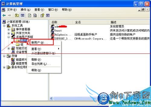 3、点开“用户”,在“用户”上点击你的鼠标右键点击“新用户”,来创建一个将来用来隐藏的用户。