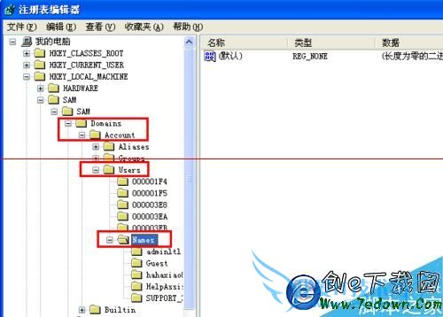 5、此时我们已经能展开SAM下面的选项的,再依次展开“Domains-->Account--->Users---->Names”。