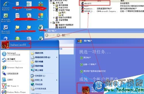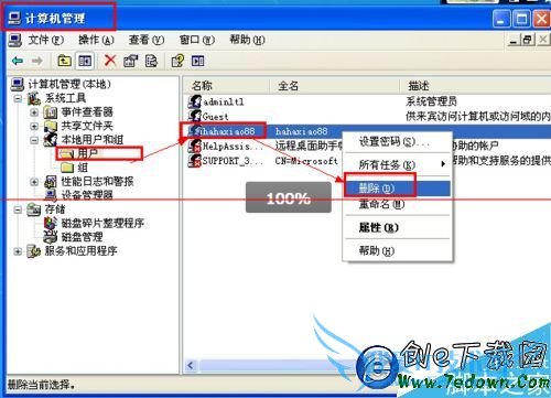 10、我们重新打开之前增加“hahaxiao88”账号的“计算机管理”窗口。然后在用户里面的“hahaxiao88”用户上点击鼠标右键--->删除--->是。