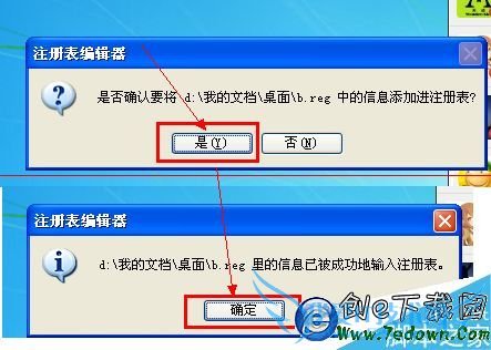 11、最后我们运行a与b.reg这两个我们之前导出的注册表文件,把“hahaxiao88”写入到注册表中去。双击a与b.reg后,依次点击“是”-->“确定”。