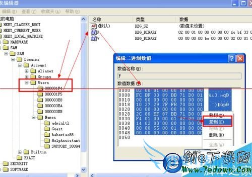 7、在“Names”上一级的“Users”项中,找到含有“1F4”那个项。左键点击它,双击F,复制里面的值。