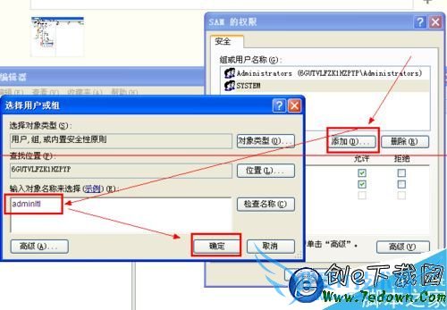 3、点击“添加”按钮,把当前登陆这台电脑的账户添加进“组/用户名称”里面去。我当前用户的名字是“adminltl”,然后输入adminltl后点击确定!