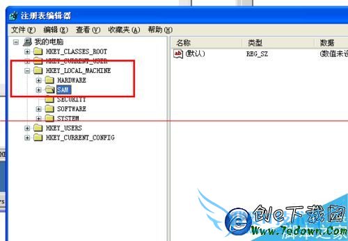 1、依次展开“[HKEY_LOCAL_MACHINE\SAM]”,然后点击SAM前面的“+”号。