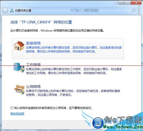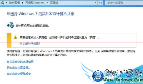 如果看到以下窗口,说明网络位置设置不正确。Windows 7 将网络分成家庭、工作和公共三种位置,只有处于家庭网络位置的计算机,才能创建家庭组。