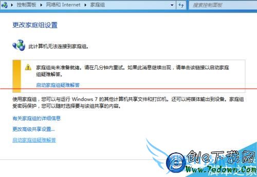 控制面板-->搜索家庭组-->单击启动家庭组,如果看到以下窗口,则说明家庭组依赖的服务或协议没有正常运行。
