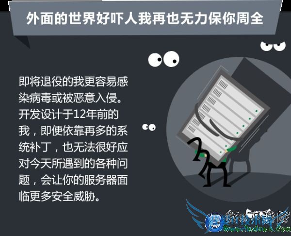 2015年07月14日将是我工作的最后一天。到时候,Windows Server 2003技术支持服务将会终止。这意味着,从此之后——你将不能获得关于我的安全更新,我也无法再获得来自微软大佬的技术支持。