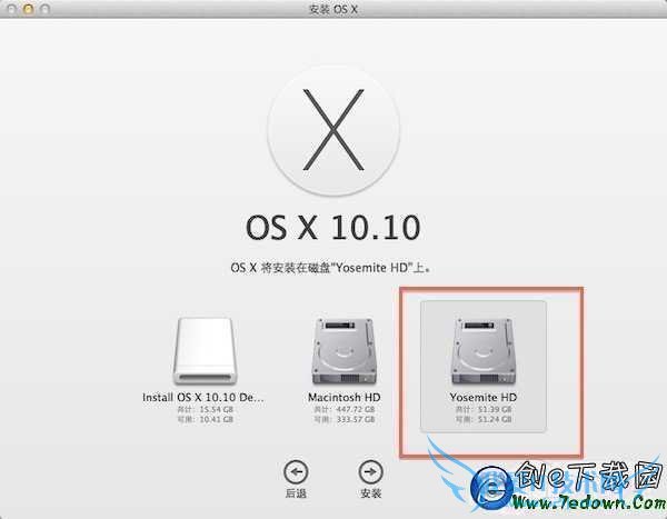 3、安装:要记住的是一定要把Yosemite安装刚刚所新分出来的50GB硬盘里面,这样才不会覆盖原来的系统。