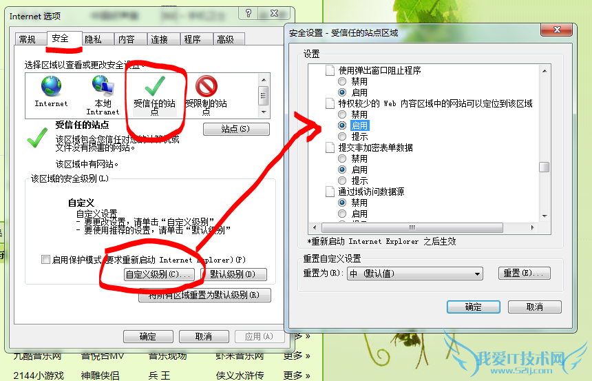 2、在受信任的站点的设置中 “特权较少的Web内容区域中得网站可以定位到该区域”设置为“提示”。