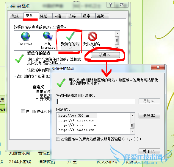 在Internet选项中,受信任的站点列表可能由于用户或者程序(比如支付宝控件、网银控件)的修改,被添加了某些站点,用于提醒浏览器这些站点是受信任的。