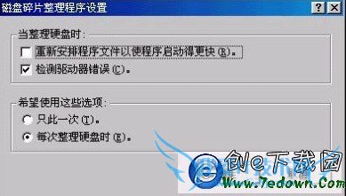 2.单击“设置”按钮,系统弹出磁盘碎片整理程序设置对话框(图1),清除“重新安排程序文件以使程序启动得更快”复选框。清除该选项后,磁盘碎片整理程序将按一个连续单元排放所有文件,且不对程序进行优化。这虽加快了整理的速度,但无法保证最快速启动常用程序。单击“确定”按钮。