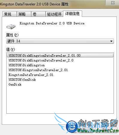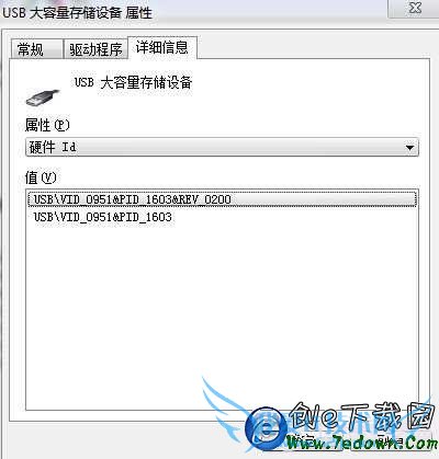 第二步:在上面点击鼠标右键来选择“属性”,在弹出的“属性”窗口中点击“详细信息”标签,然后在设备“属性”下拉框中选择“硬件ID”,下面的“值”中会出现字符串,这个就是你的U盘的硬件ID,把它复制出来保存好。