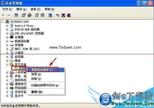 5、这时候在设备管理器中,在RNDIS设备上单击右键,出现菜单点击更新驱动程序。