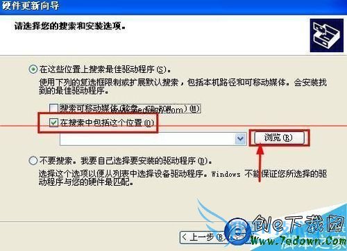 7、硬件更新向导的这里我们选择在搜索中包括这个位置,右边的浏览。