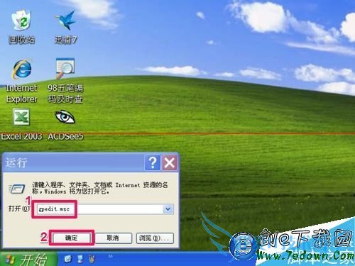 2,然后在打开的运行程序的编辑框中,输入gpedit.msc命令,确定。