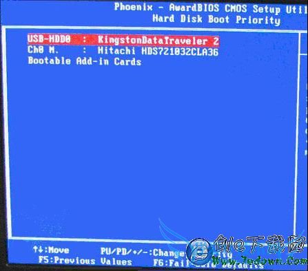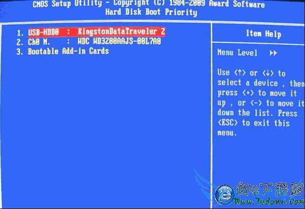上图3-1:进入到硬盘启动优先级(Hard Disk Boot Priority)界面后。需要使用小键盘上的加减符号(+、-)来选择与移动设备,要将U盘选择在最上面。完成前面的步骤后按住ESC键退出,便会回到图2-1的设置界面。