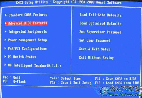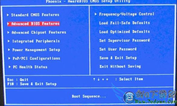 上图1:开机时按住Del键进入到该电脑的BIOS设置界面,选择高级BIOS设置Advanced BIOS Features。