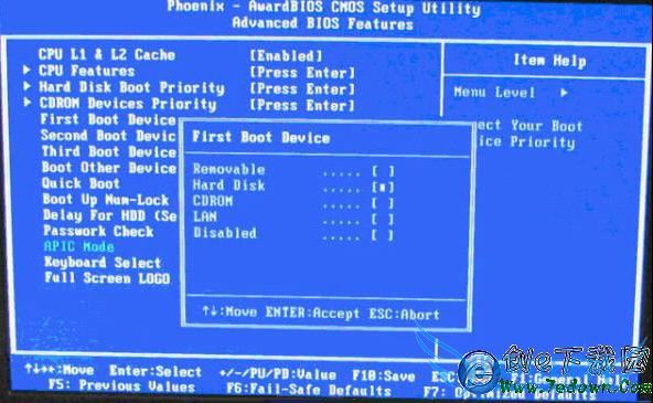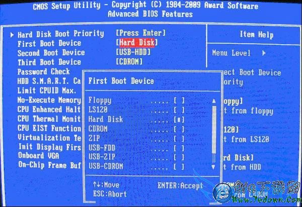 上图4:完成上一步后,再选择第一启动设备(First Boot Device):该版本的BIOS这里没有U盘的“USB-HDD”、“USB-ZIP”同类的选项,选择移动设备“Removable”也不能正常启动。但是,选择“Hard Disk”就可以启动电脑。