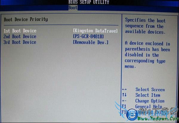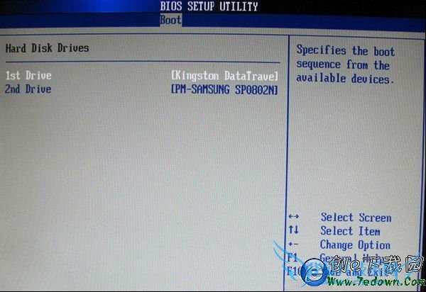 上图4-2 :当我们之前就在图3的硬盘驱动器“Hard Disk Drives”中选择U盘作为第一启动设备“1st Drive”后,要启动优先级设备选择(Boot Device Priority),这时才会显示有U盘,然后我们就可以优先选择U盘作为第一启动设备(1st Boot Device)。