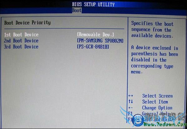 如果在图1-2的硬盘驱动器“Hard Disk Drives”里面没有将U盘作为第一启动设备,那么,在这里就不会存在和显示U盘,如上图2-2所示。但是,我们可以选择移动设备“Removable Dev.”来作为第一启动设备;