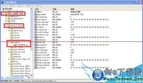 4、然后展开HKEY_CURRENT_USER\Control Panel\Desktop\WindowMetrics。