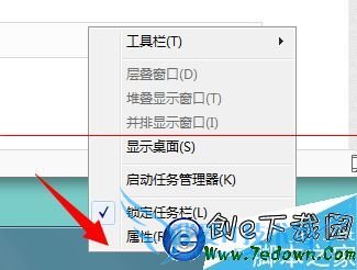 2、右键点击桌面下方【任务栏】,在弹出菜单中选择【属性】选项