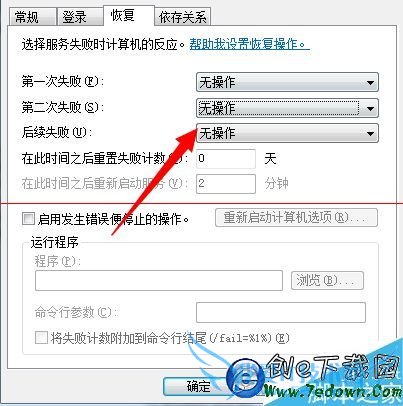 5、进入恢复界面将第一次失败,第二次失败,后续失败,后面的复选框,都选为无操作,点击确定即可
