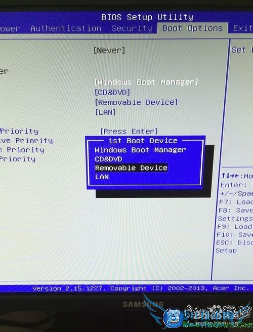 移动光标到“First Boot Device”选项,然后按"Enter"键。出现对话框后,将光标移动到“Removable Device”,然后按“Enter”.