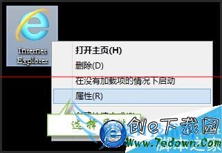 1、在桌面找到IE图标,左键单击,选择属性;