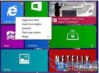 可以看到,现在在Metro开始屏幕中可以通过点击右键来实现更方便地操作,而不是必须使长按触摸屏。右键点击应用图标后,可以实现取消、卸载、从新窗口打开或是调整图标尺寸等操作。