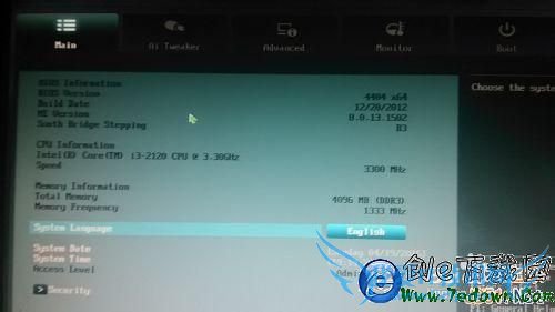3、进入bios设置界面,首先看到的是main(概要)选项卡,默认语言是English,当然也可以手动选择为简体中文